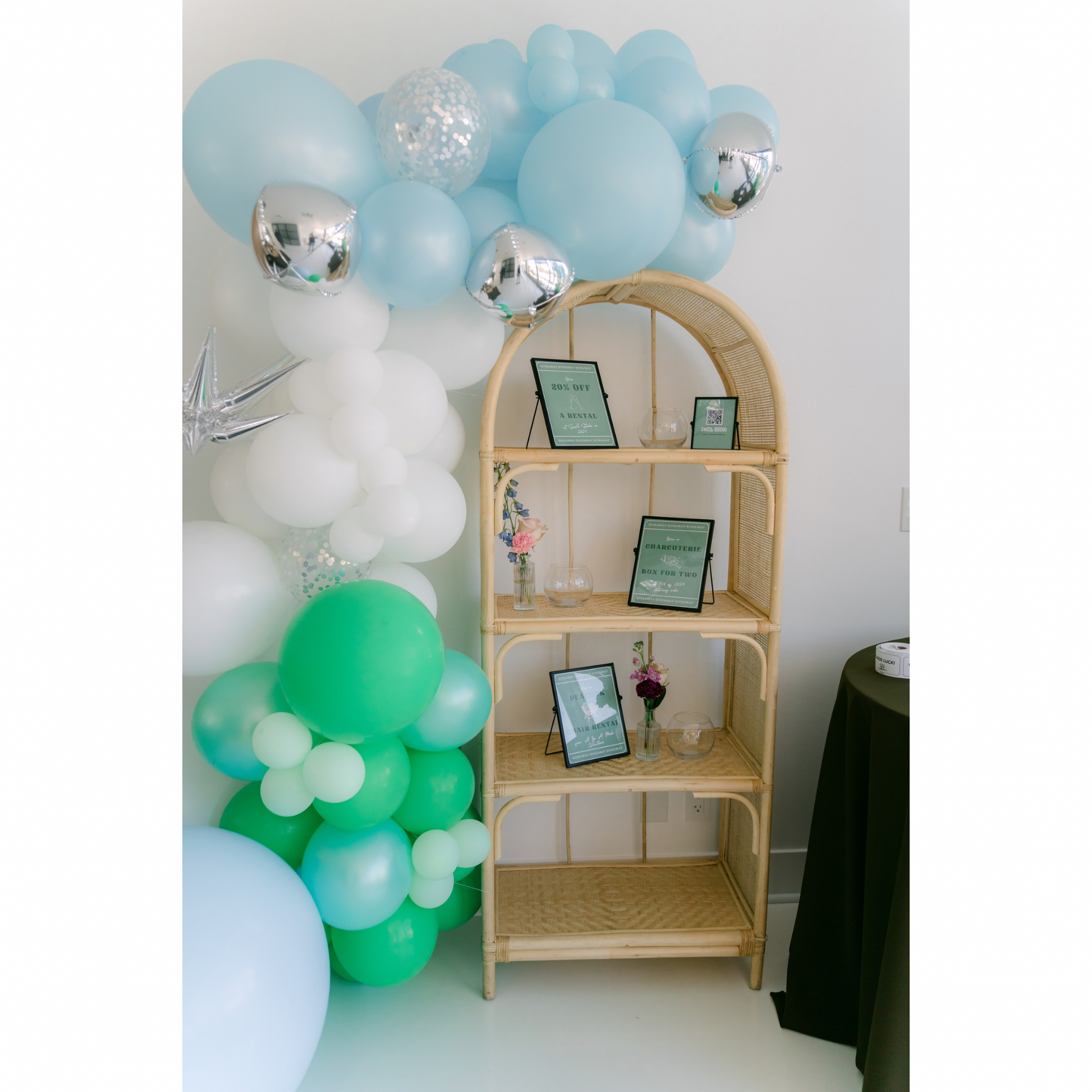 Welcome to the finest selection of party decor, where we present our stunning Bamboo & Cane Etagere for rent. This exquisite piece of furniture is beautifully handcrafted from authentic bamboo and cane, providing a unique blend of natural elegance and charm for your rustic party decor. The Etagere is designed with four spacious shelves to display your desserts, florals, gifts & photo memorabilia for all your guests to enjoy! Its lightweight structure and compact size make it an ideal choice as a photo prop for your baby shower or bridal shower. The warm, earthy tones of the bamboo and cane will bring a touch of organic beauty to any room, while its intricate weave pattern adds a sophisticated touch. Rent it today to elevate the aesthetics of your special event with minimal effort. We guarantee it will be a conversation starter among your guests!